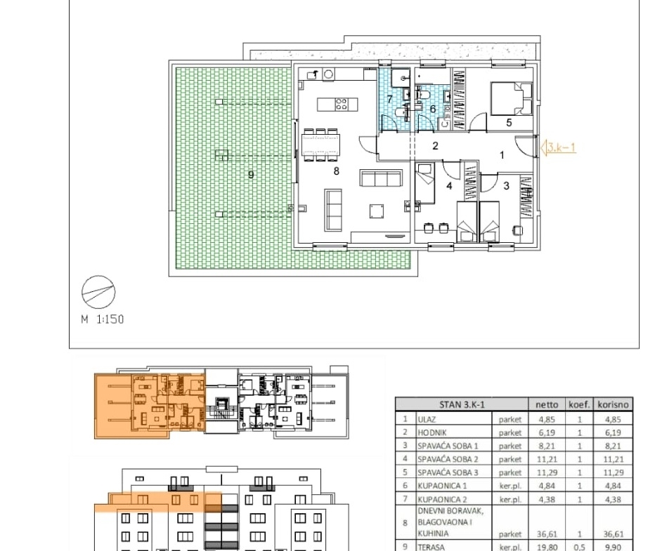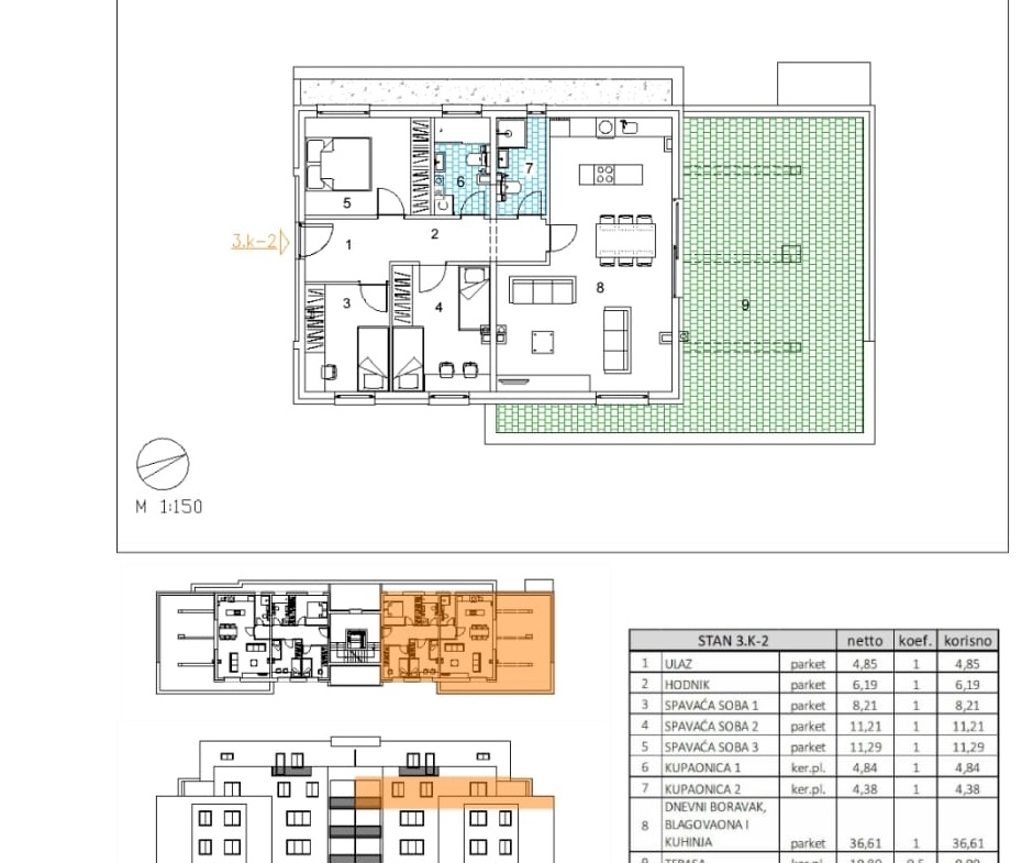 Prostranog dnevnog boravka s blagovaonicom i kuhinjom, s izlaskom na prostranu terasu, 3 spavaće sobe, 2 kupaonice, ulaznog prostora i hodnika.
