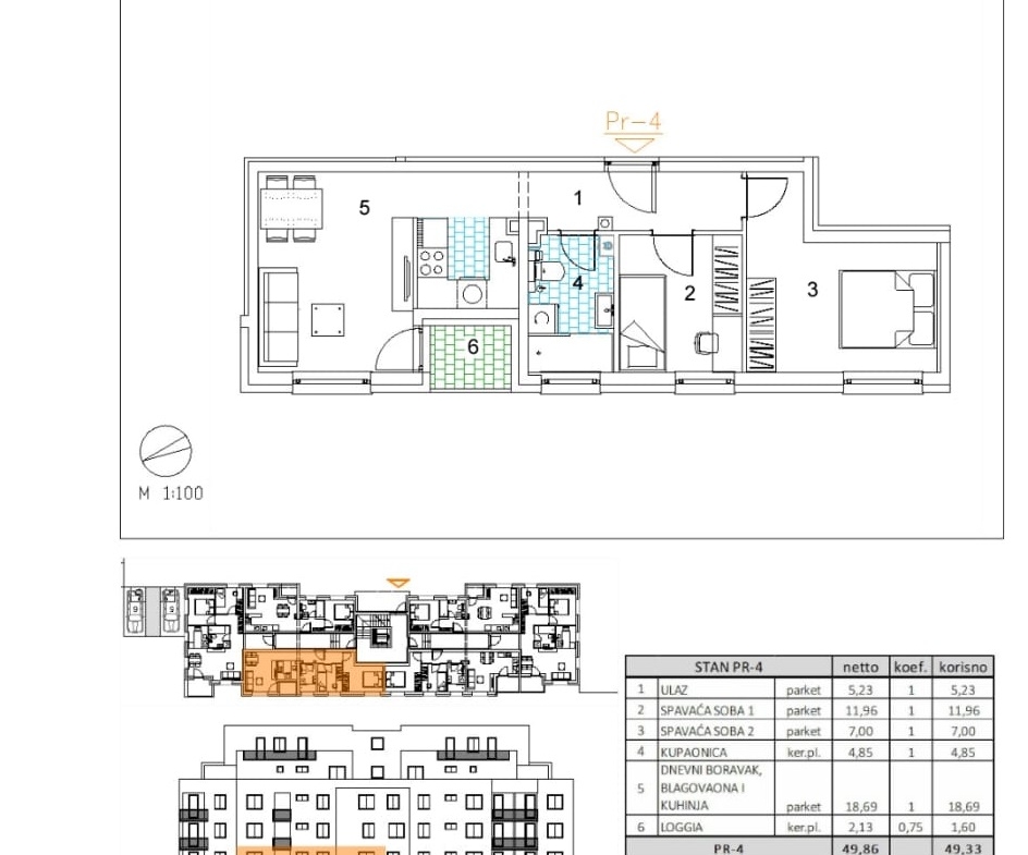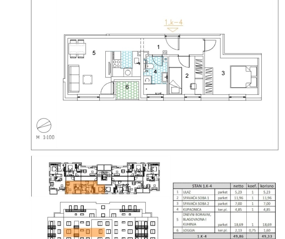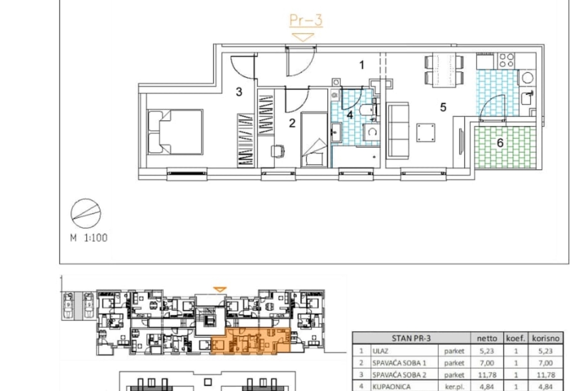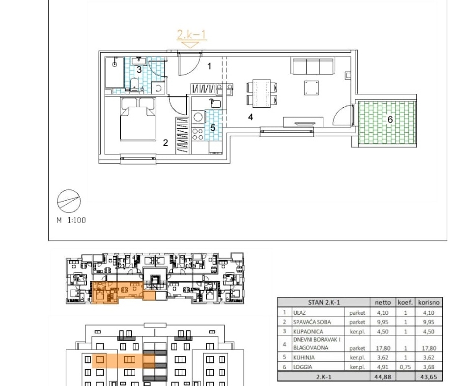 Netto površina stana je 43.65 m2, a sastoji se od: