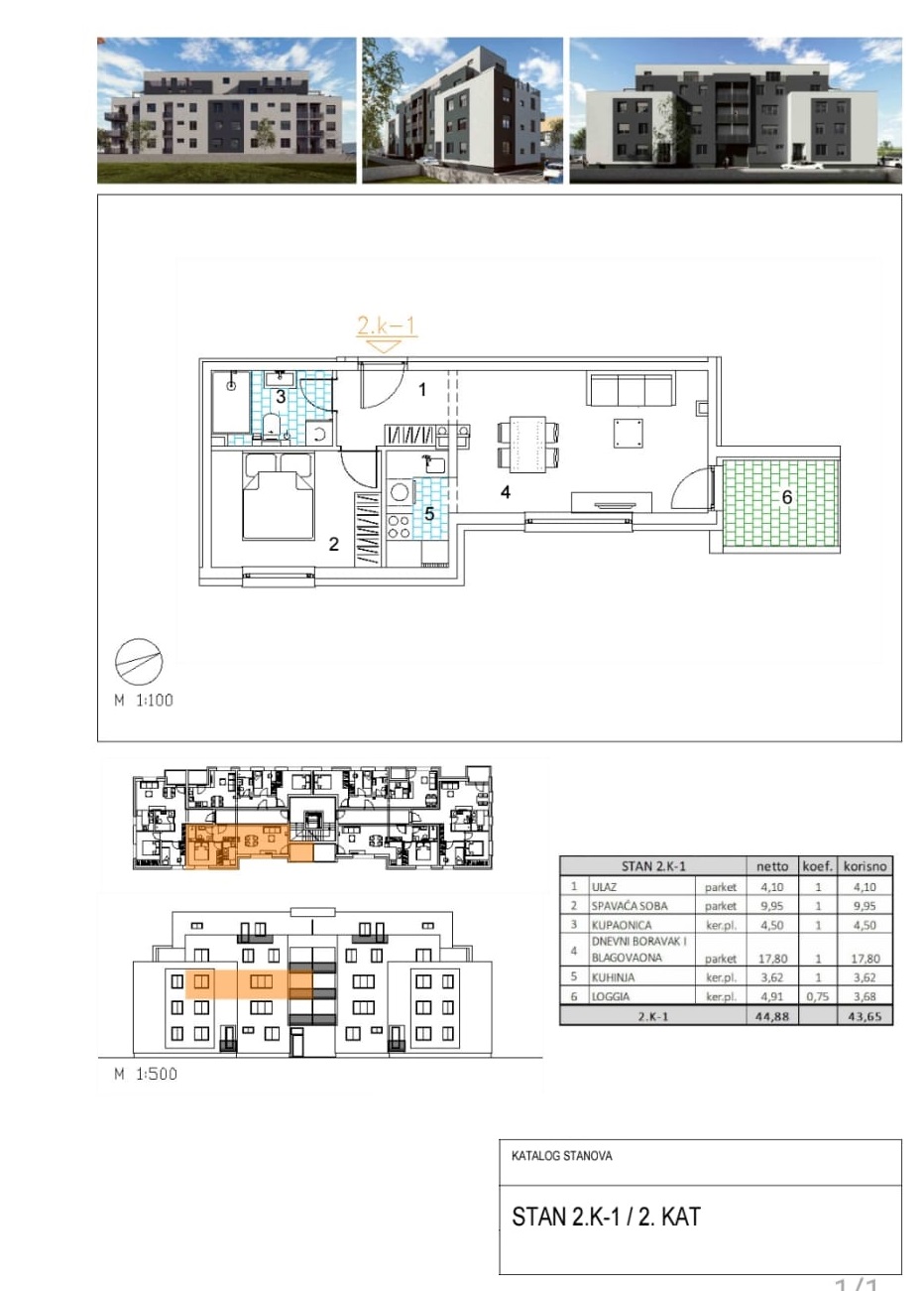 Stan od 43.65 m2, nalazi se na 2. katu kvalitetne novogradnje, od ukupno 5 katova, energetskog razreda A/A+. Već prepoznata kvaliteta provjerenog investitora, osigurava odličnu izvedbu i dobro osmišljen projekt.