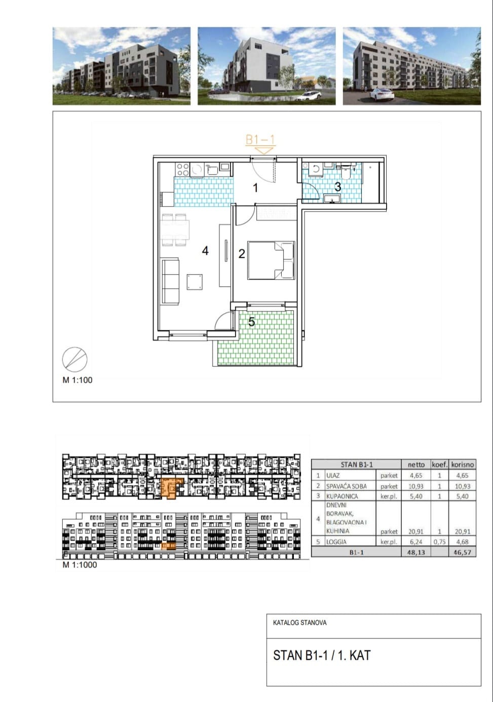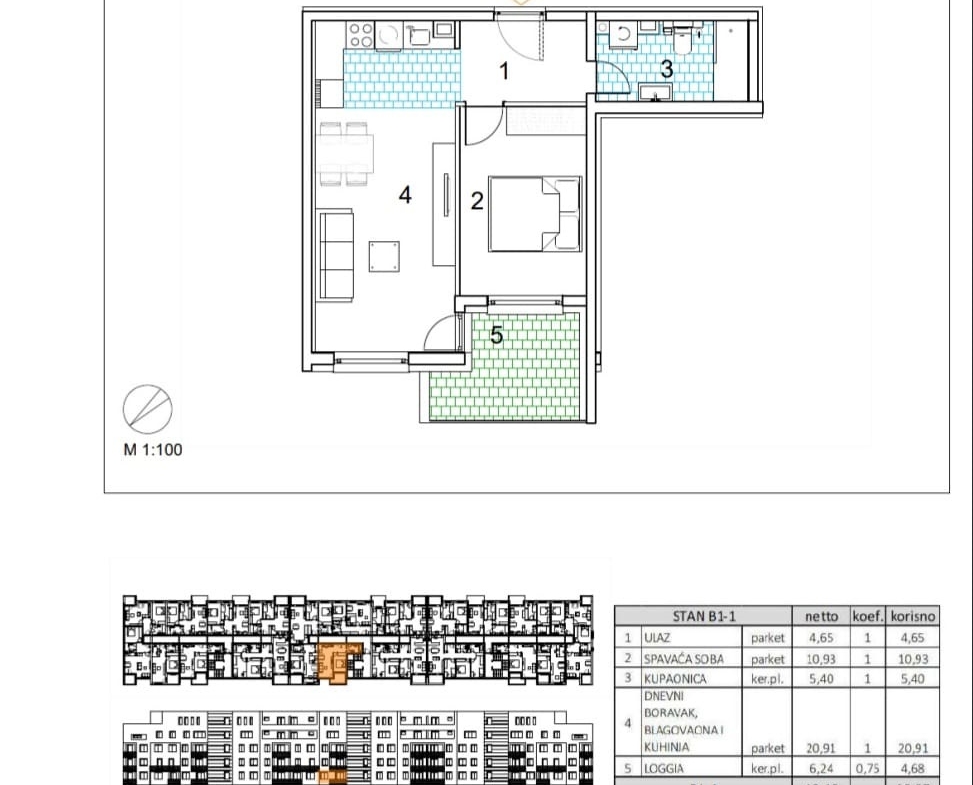 Netto površina stana je 46.57 m2, a sastoji se od: