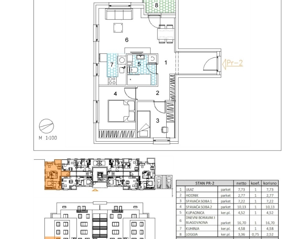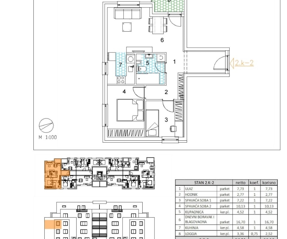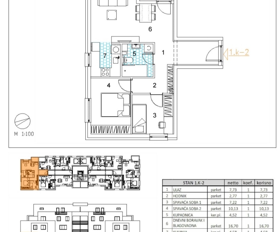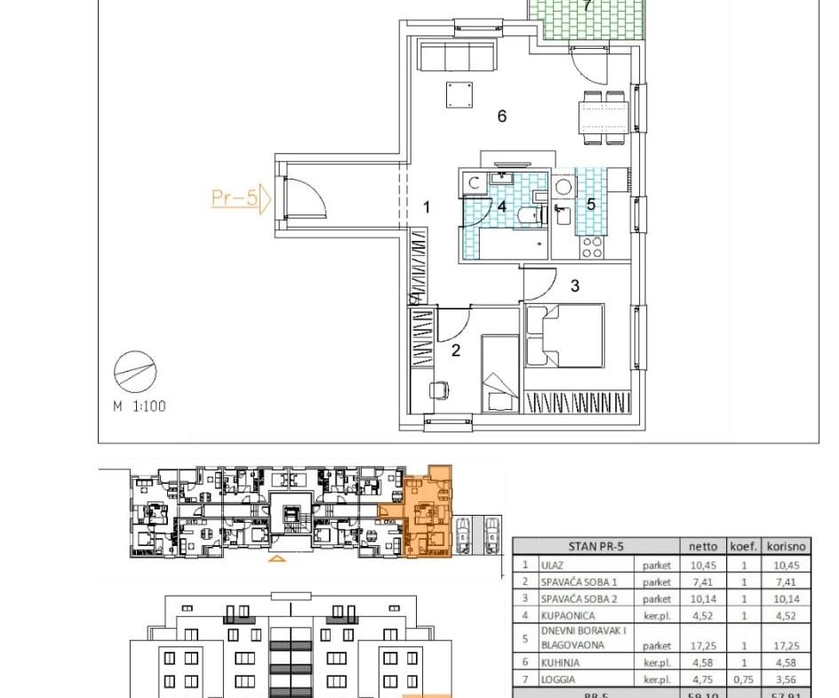 Netto površina stana je 56.17 m2, a sastoji se od: