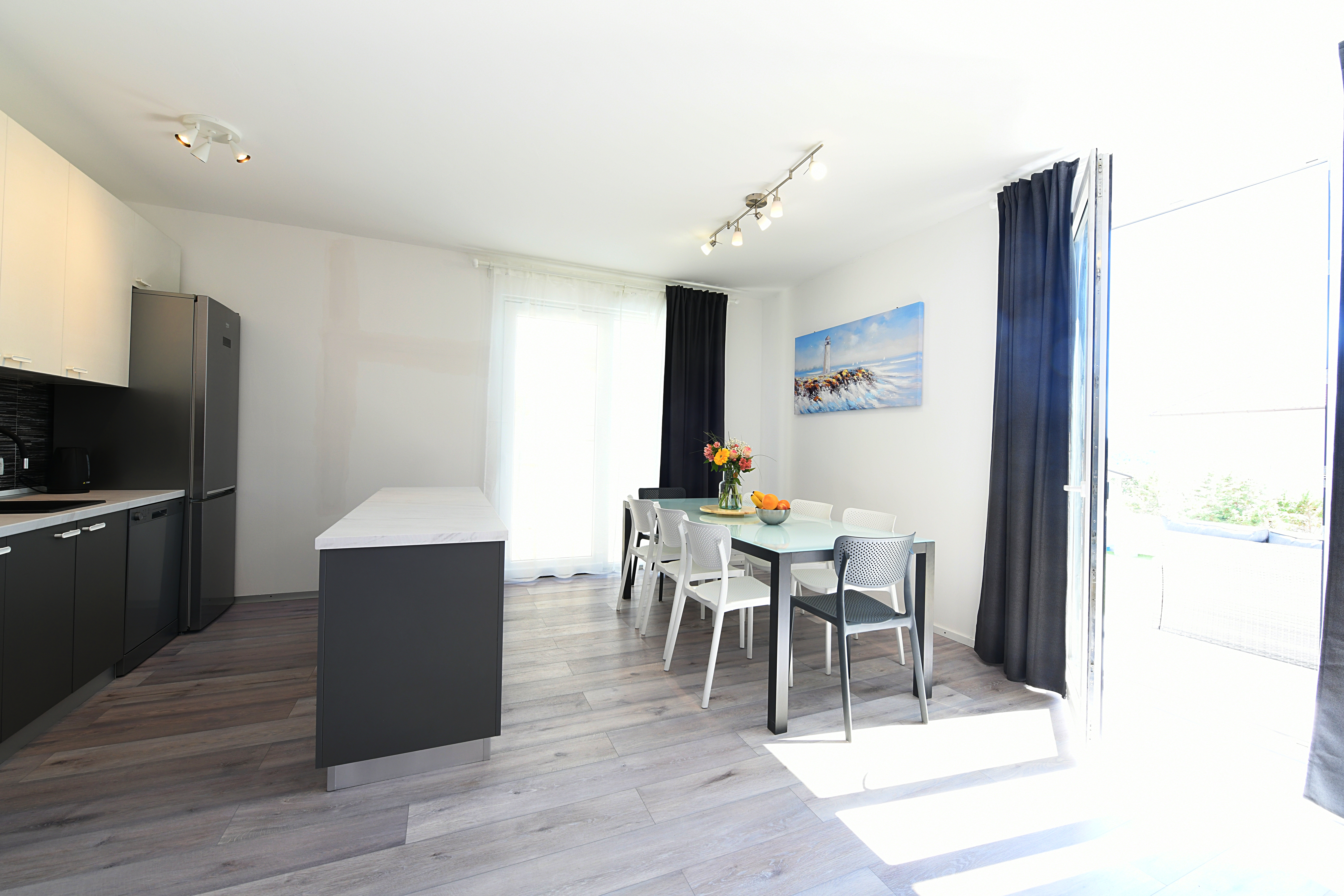 U prizemlju se nalazi prostrani dnevni boravak s blagovaonicom i moderno opremljenom kuhinjom te ostavom, dok su sve prostorije klimatizirane i ispunjene prirodnim svjetlom.