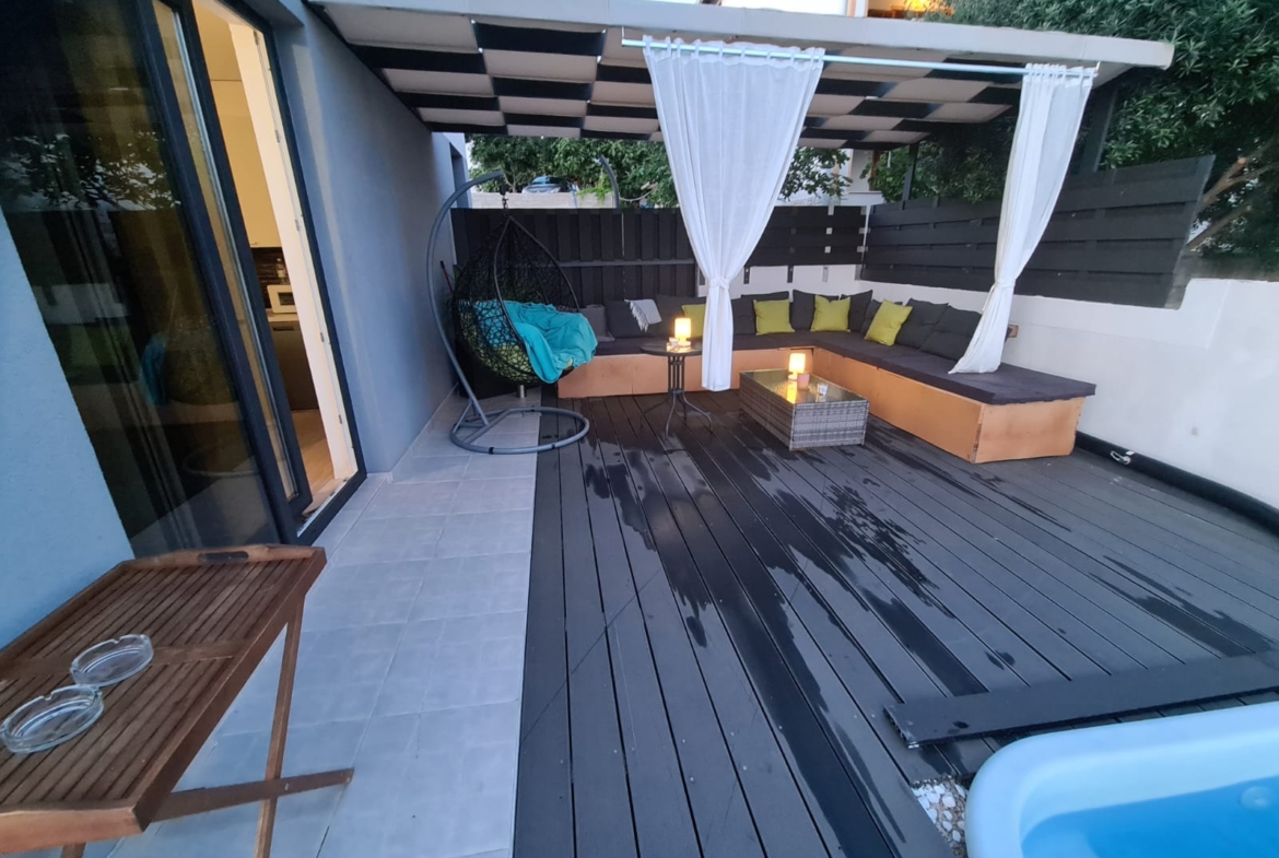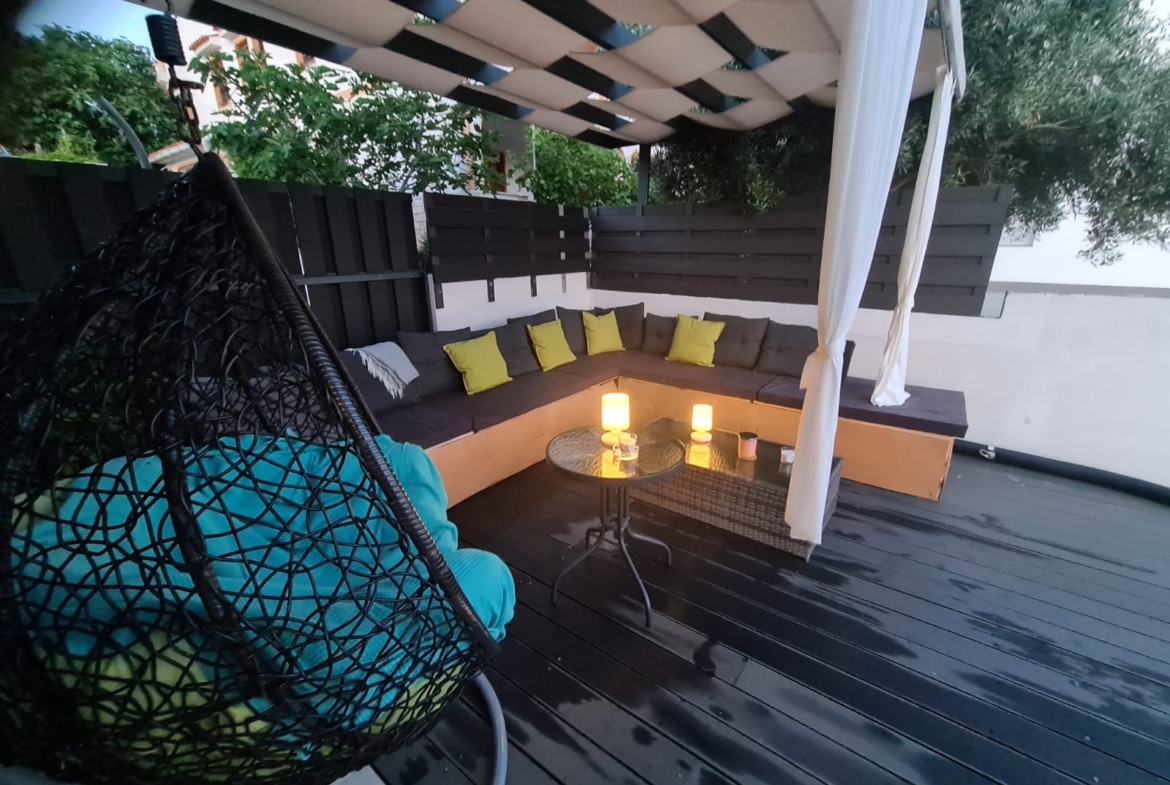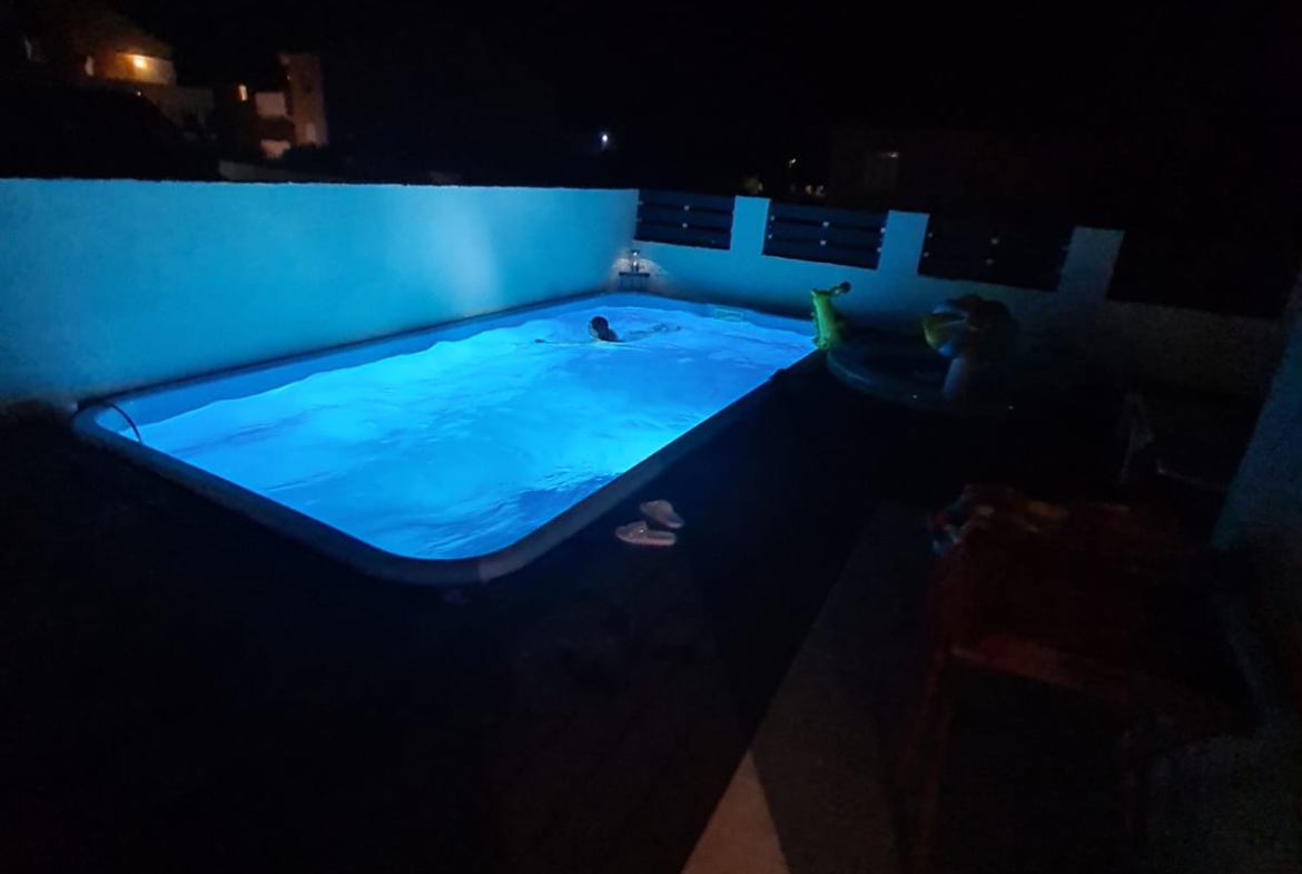 Ova elegantna nekretnina raspolaže s tri spavaće sobe i tri kupaonice, a svaki detalj u interijeru pomno je biran kako bi se postigla maksimalna udobnost i estetska usklađenost. Iz prostranog vrta s bazenom pruža se prekrasan pogled na more, dok pažljivo uređeni eksterijer nudi potpunu privatnost i mir. Ukupna površina vile je 104m2 +135m dvorišta. Veličina bazena je 6×3.