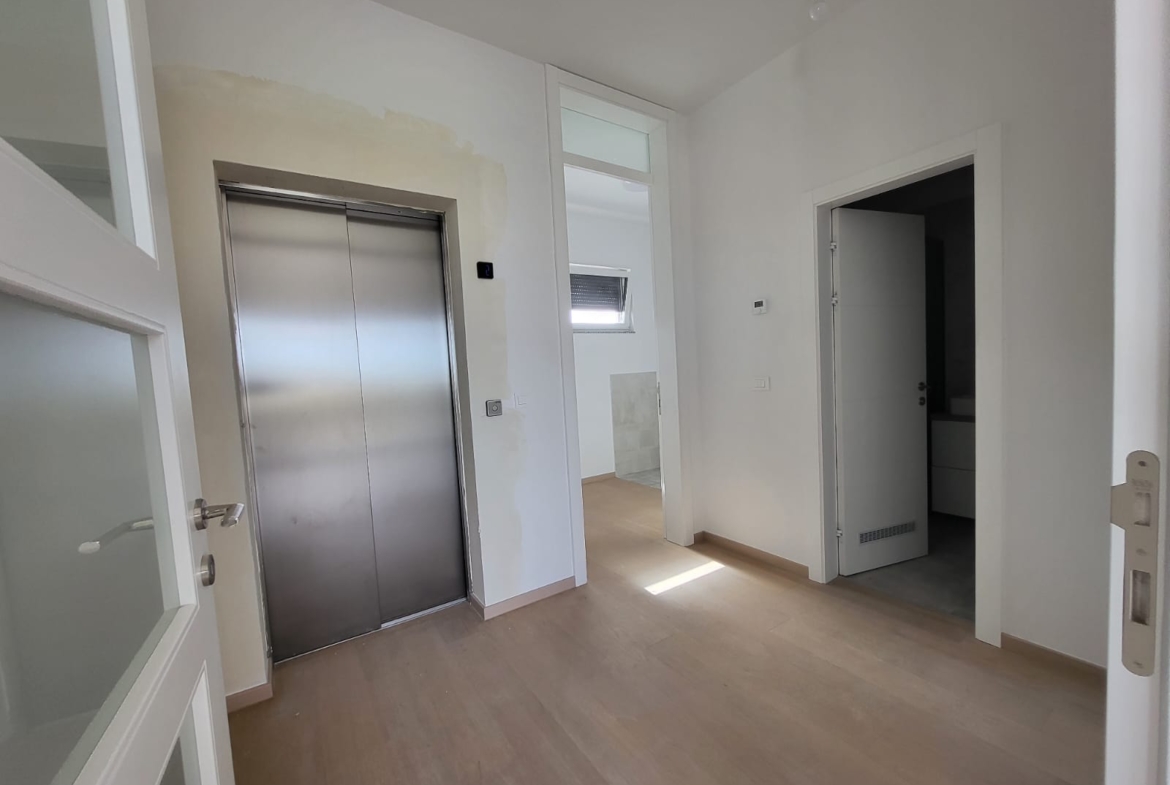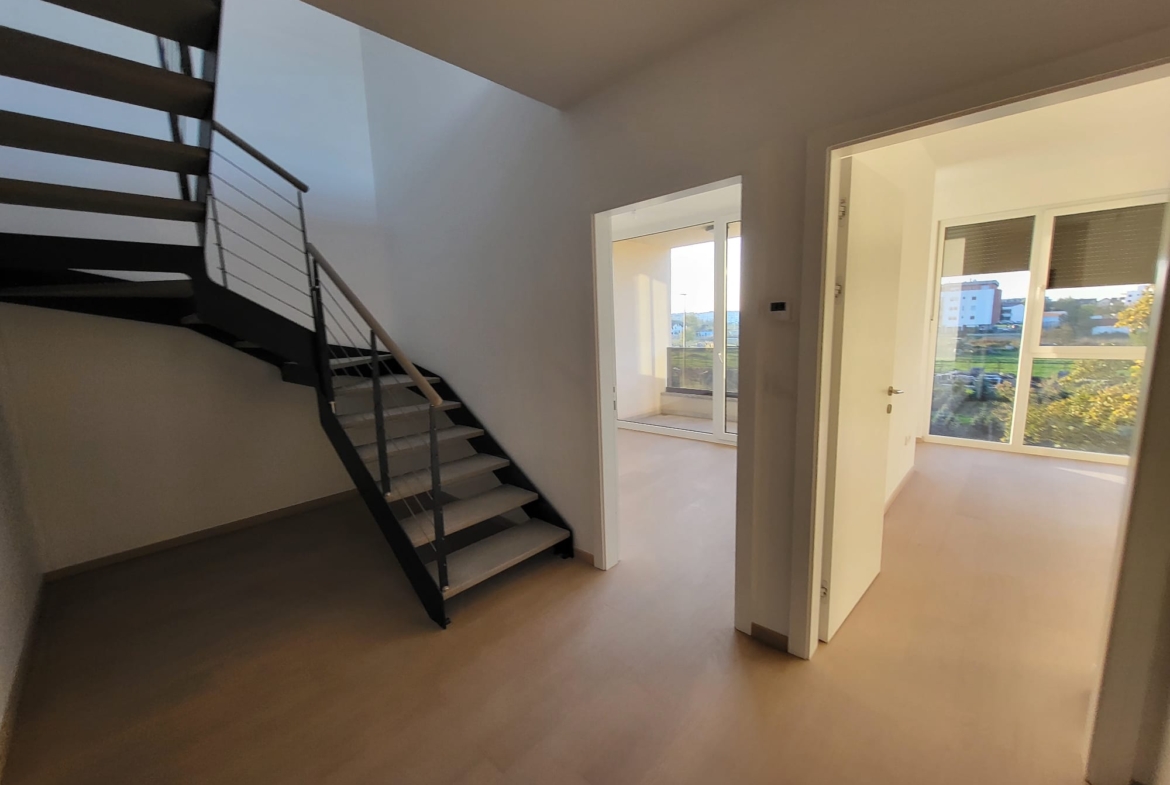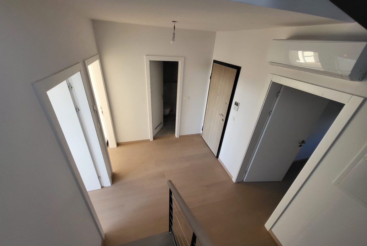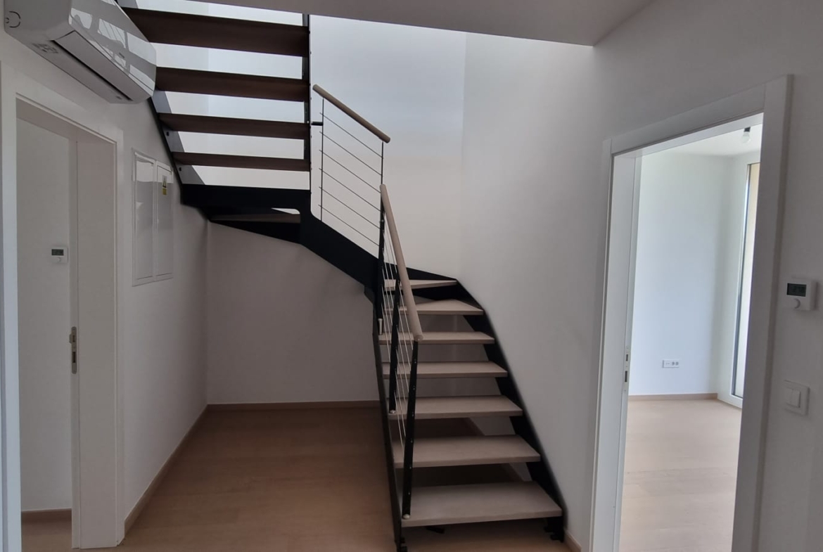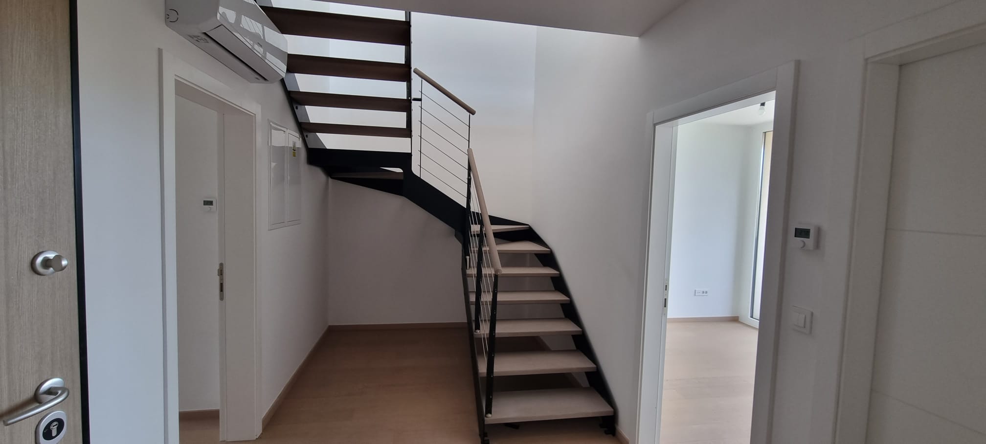 2.etaža (uvučeni kat) – prostrani dnevni boravak s blagovaonicom i kuhinjom, velikim staklenim površinama i izlaskom na prostranu terasu, degažman, vešeraj i stubište. Stan ima i pripadajuće spremište u prizemlju zgrade.