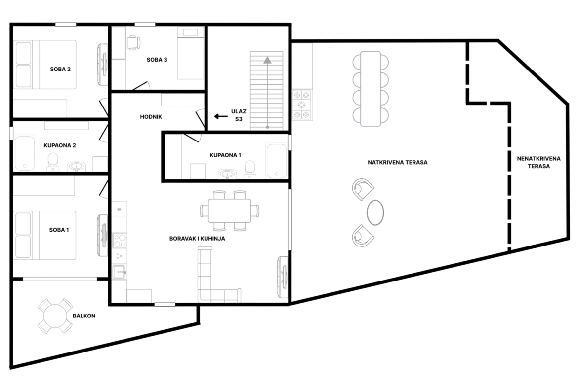 Stan od 136.58 m2, sastoji se od: hodnika, prostranog openspace dnevnog boravka s kuhinjom i blagovaonicom (34.51 m2), koji ima izlazak na prostranu terasu (natkriveni dio 52.40 m2 + nenatkriveni dio 19.56 m2, 3 prostrane spavaće sobe, od kojih jedna ima izlazak na balkon veličine 8.97 m2, 2 kupaonice. Spremište i 2 garažna parkirna mjesta ukupne su kvadrature 38.23 m2.