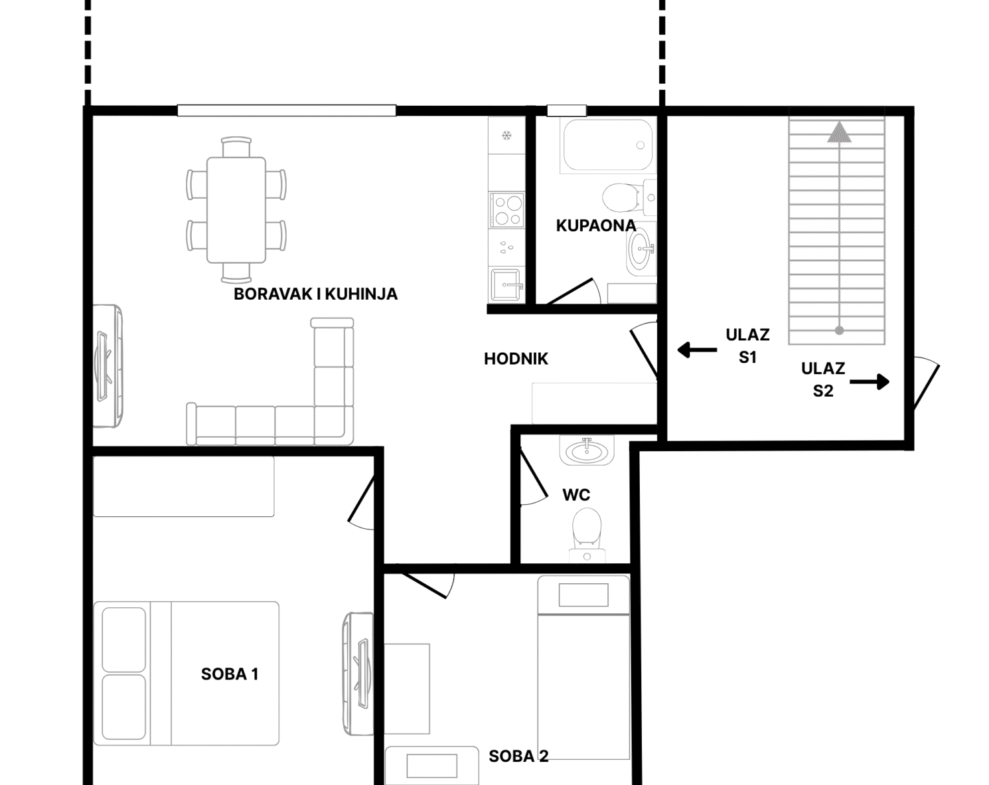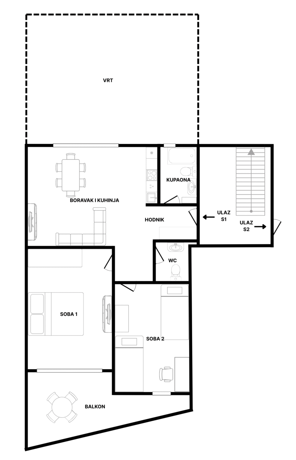 Stan od 84.41 m2, sastoji se od: hodnika, prostranog openspace dnevnog boravka s kuhinjom i blagovaonicom (28.36 m2), koji ima izlazak na vrt veličine 33 m2, dvije prostrane spavaće sobe, kupaonice i dodatnog toaleta, te balkona koji ima pristup iz obje spavaće sobe (8.97 m2). Spremište i garažno parkirno mjesto ukupne su kvadrature 26.50 m2.